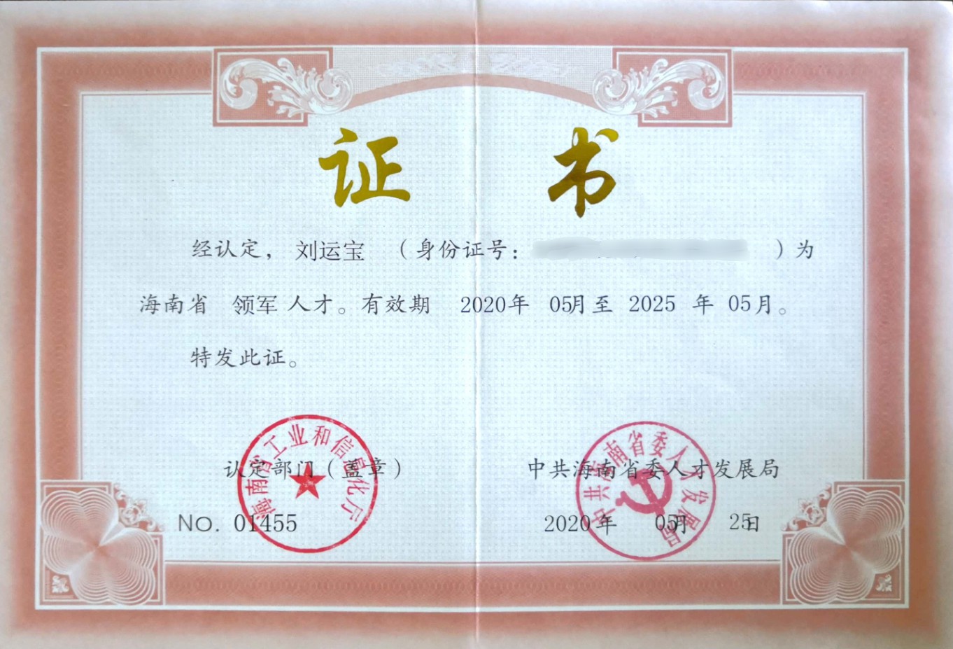2020年(nián)5月,公司總經理(lǐ)劉運寶被評爲海南(nán)領軍人(rén)才。海南(nán)領軍人(rén)才是海南(nán)省委省政府、海南(nán)省人(rén)力資源保障廳等部門(mén)爲建設海南(nán)自(zì)由貿易區(港)引進的一類高層次人(rén)才。